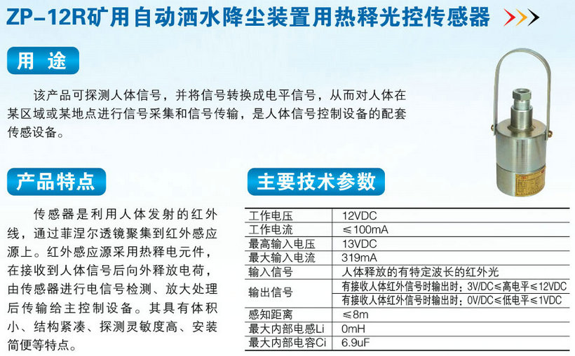 ZP-12R礦用自動(dòng)灑水降塵裝置用熱釋光傳感器 2018-6-11 本文被閱讀 4472 次